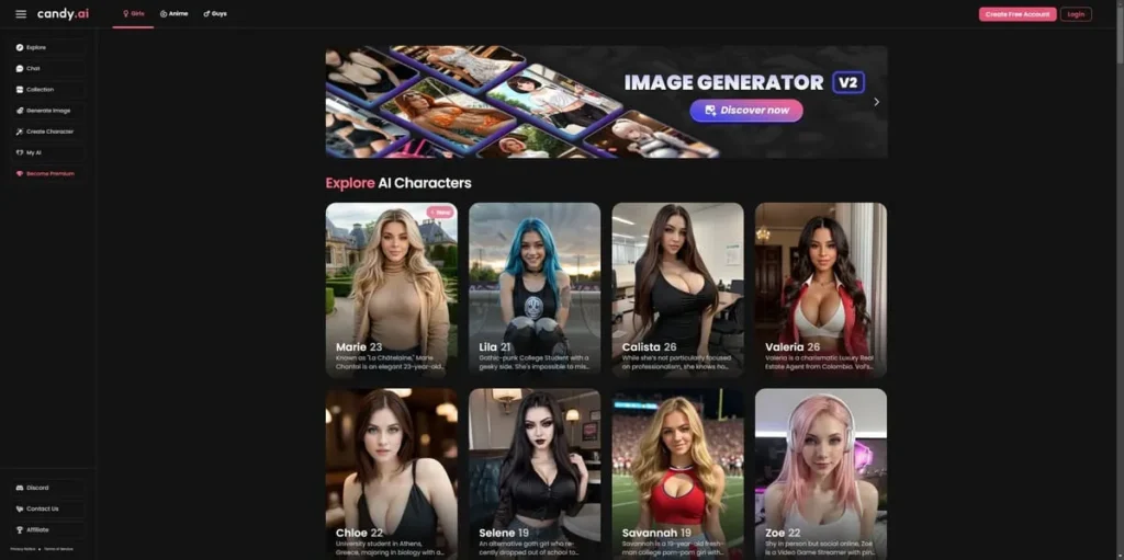 Simply sign up on their website or app! You can immediately begin a free chat with pre-made characters to get a feel for the uncensored AI chat style. To dive deeper, use the “Create” button to start building your own custom AI characters from scratch.