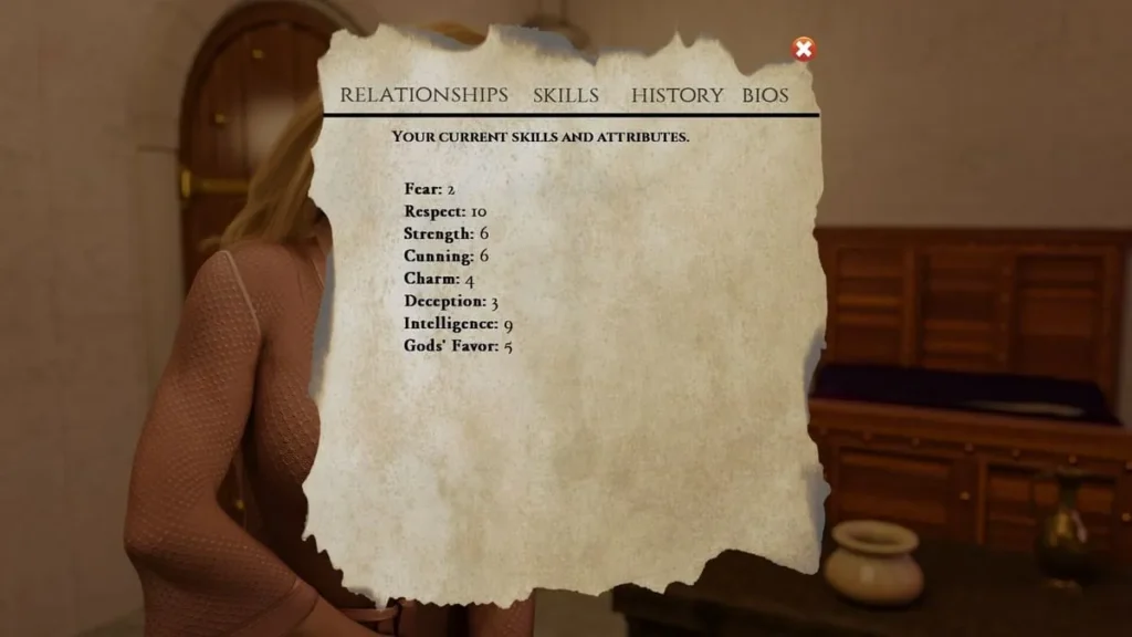 | Relationships & Court | Character Affection, Trust, Leverage (Secrets), Political Debt | Private conversations, gift-giving, fulfilling promises, blackmail, romantic pursuits | Unlocks critical information, secures key votes in the Senate, and turns rivals into assets. The human element of power. |
